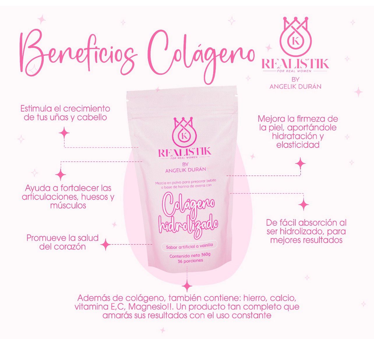 Es suplemento en polvo con sabor artificial a vainilla, diseñado para cuidar tu piel, articulaciones, uñas y cabello desde adentro. Gracias a su fórmula enriquecida con vitaminas, minerales y su colágeno hidrolizado de alta absorción, es ideal para mujeres que desean verse y sentirse radiantes cada día.